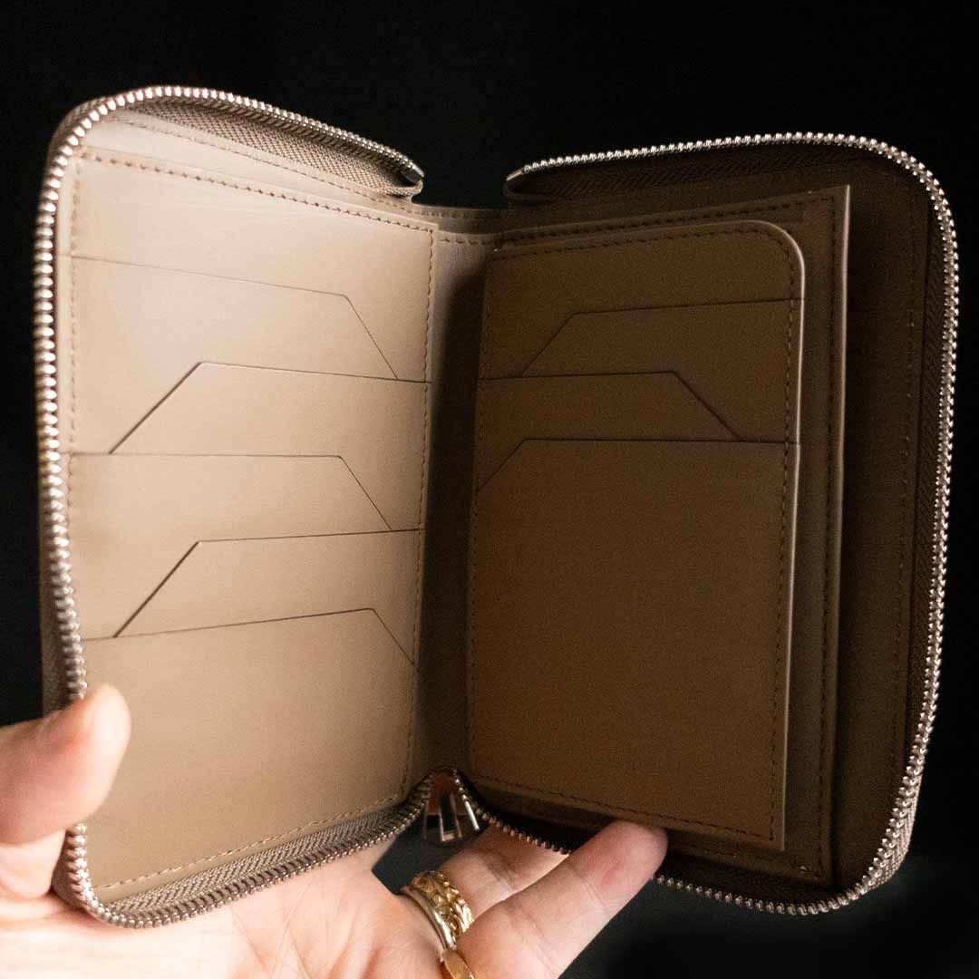 よく見られる長財布よりも高い収納力を誇りながら、デニムパンツなどのバックポケットにも入るよう設計。通帳、パスポートが縦に入るサイズを担っていることも魅力の一つです。カード段の下に隠れたコインポケットは、ボックスと言われる、しっかり開きコインの見やすいタイプを採用。