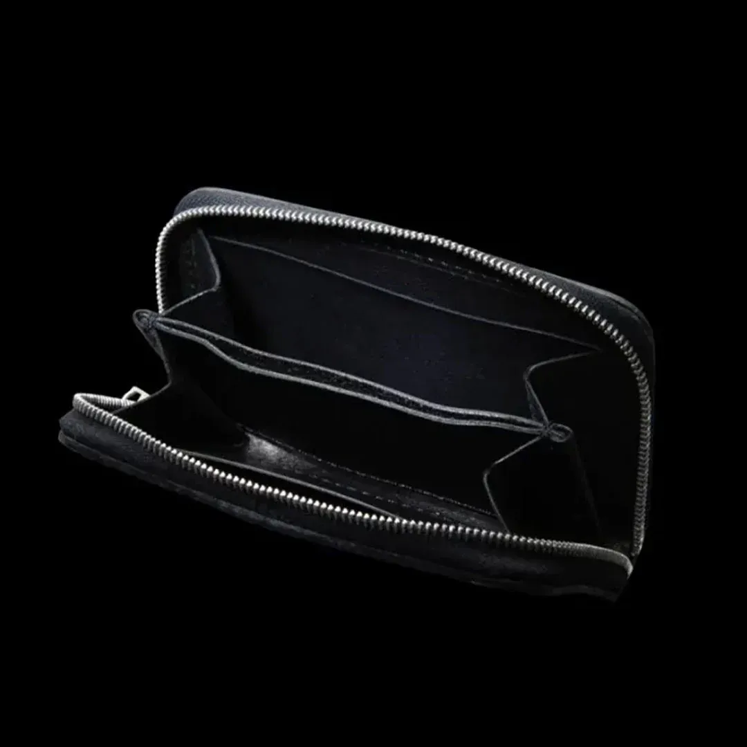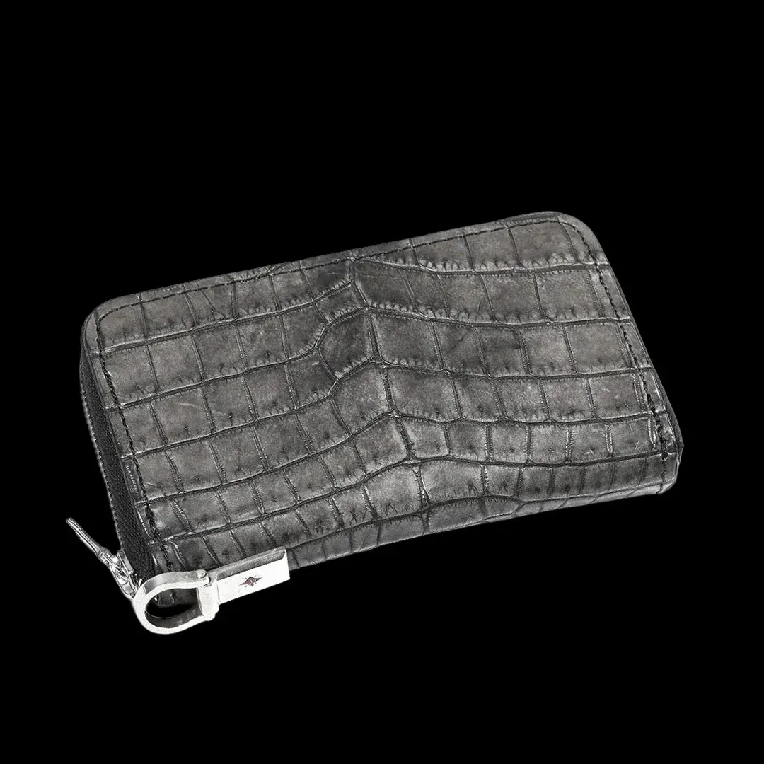 エキゾチックレザーの最高峰クロコダイルの皮革を使用。野性味の強い迫力のある表情は、鰐革でしか味わえない存在感を放っています。多種多様な鰐革の中でも均整が取れた表情の良いもののみを選別、丁寧に鞣しの工程を重ね耐久性のある仕上がりになっています。インサイドには頑丈で高級感のあるイタリアンオイルバケッタレザーを使用。グレーカラーは墨による染色を施しています。ミニラウンドファスナータイプのコインケース。コインケースの名称ですが内側に収納箇所を配備し、少量の札やカードの収納を可能にしています。小ぶりなスマートに纏め上げたサイズ感とは裏腹に、高い機能性を実現したデザイン。